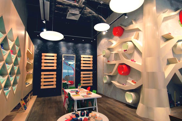 ¡Parece un gran parque de juegos! Pizarras, sillas y mesitas infantiles, hermosas estanterías con forma de árbol y circulares... sobre un espacio diseñado especialmente para los niños en el que pueden interactuar con el producto mismo, teniendo toda la colección al alcance de sus manitas... ¡Todo un acierto decorativo a todos los niveles! ¿no os parece?